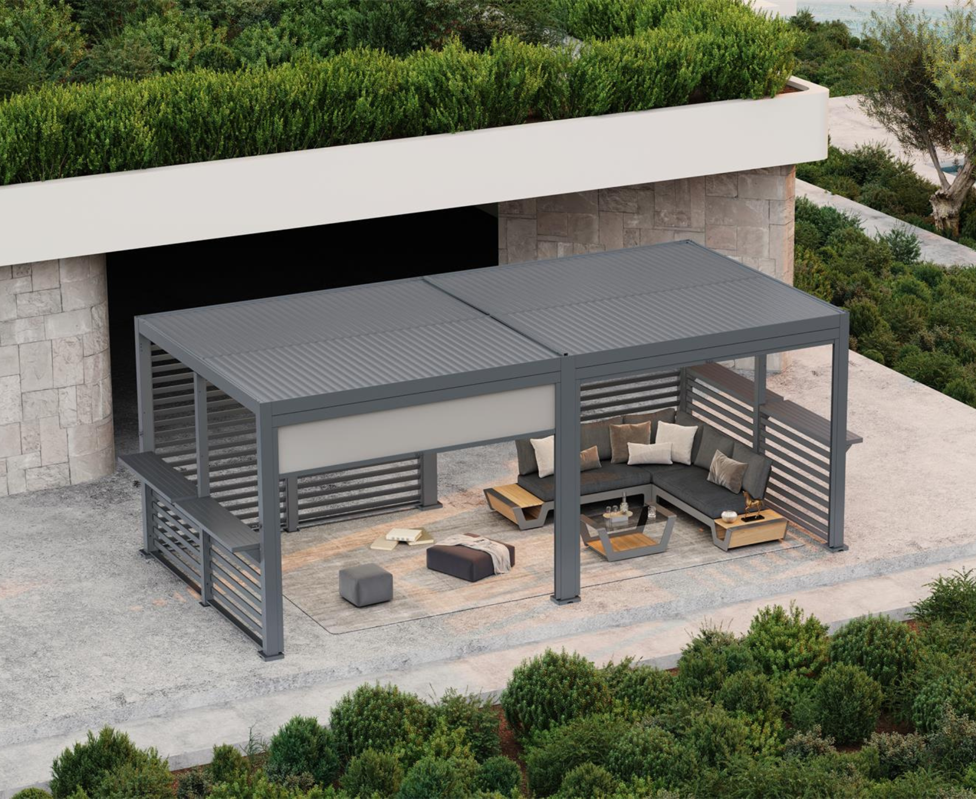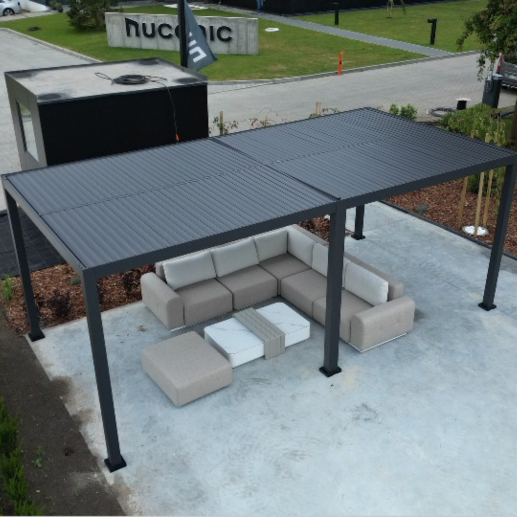 Wykonana z aluminium pochodzącego z recyklingu, ze wzmocnionymi ścianami wewnętrznymi dla większej stabilności, pergola ta jest w stanie wytrzymać wszelkie warunki pogodowe, od ulewnego deszczu po śnieg (120kg/m2) i jest idealnym rozwiązaniem, aby cieszyć się przestrzenią na świeżym powietrzu przez cały rok. Łatwa w użyciu korba otwiera dach lamelowy oferując całkowitą kontrolę nad światłem słonecznym, cieniem i wentylacją.